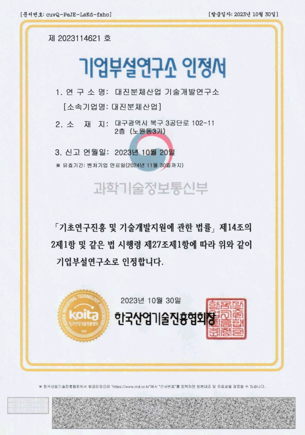 기업부설연구소 인정서 페이지 정보 작성자최고관리자 댓글 0건 조회 264회 작성일 23-11-03 18:12 본문 목록 이전글이전글제목입니다. 17.07.14 다음글다음글제목입니다. 17.07.14 댓글목록 댓글목록 등록된 댓글이 없습니다.