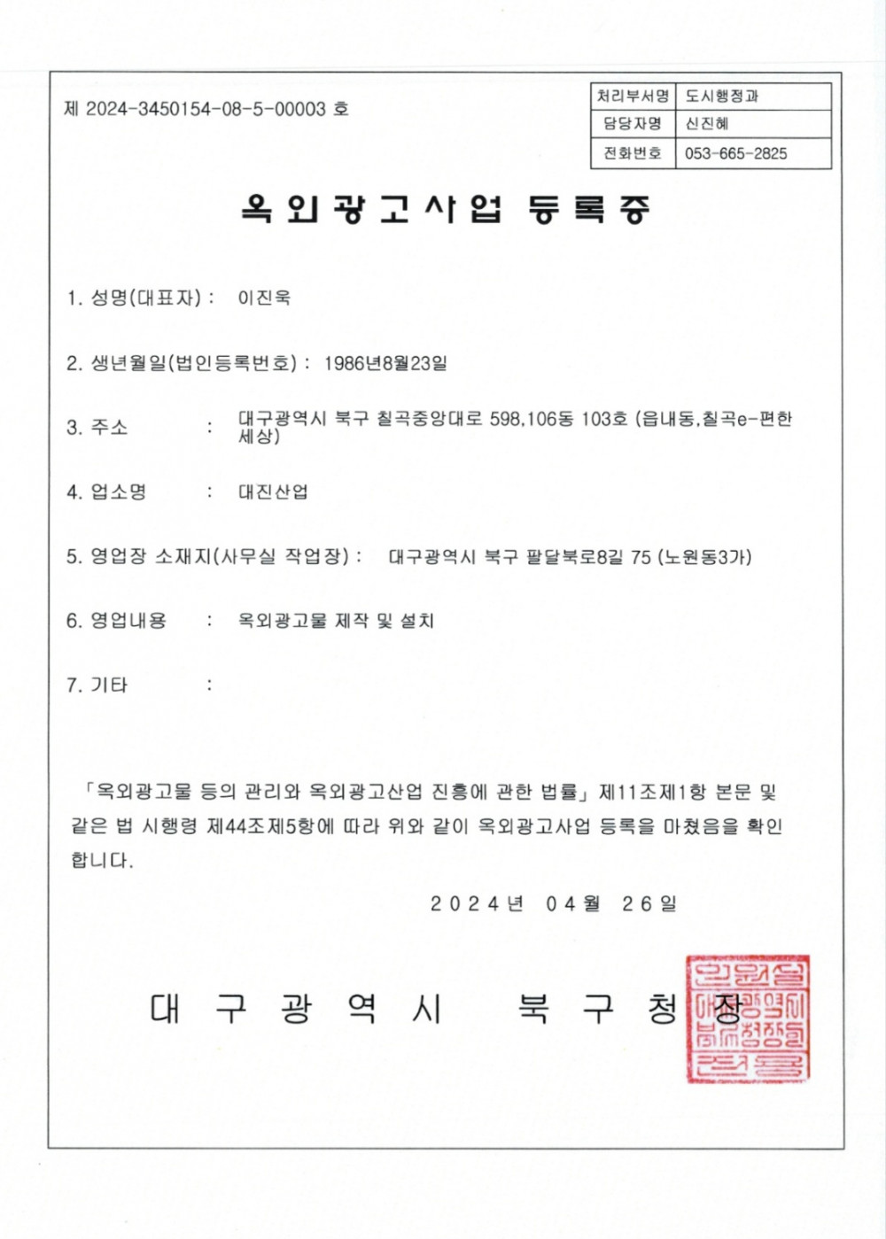 옥외광고사업 등록증 페이지 정보 작성자최고관리자 댓글 0건 조회 216회 작성일 24-04-29 15:36 본문 목록 이전글이전글제목입니다. 17.07.14 다음글다음글제목입니다. 17.07.14 댓글목록 댓글목록 등록된 댓글이 없습니다.