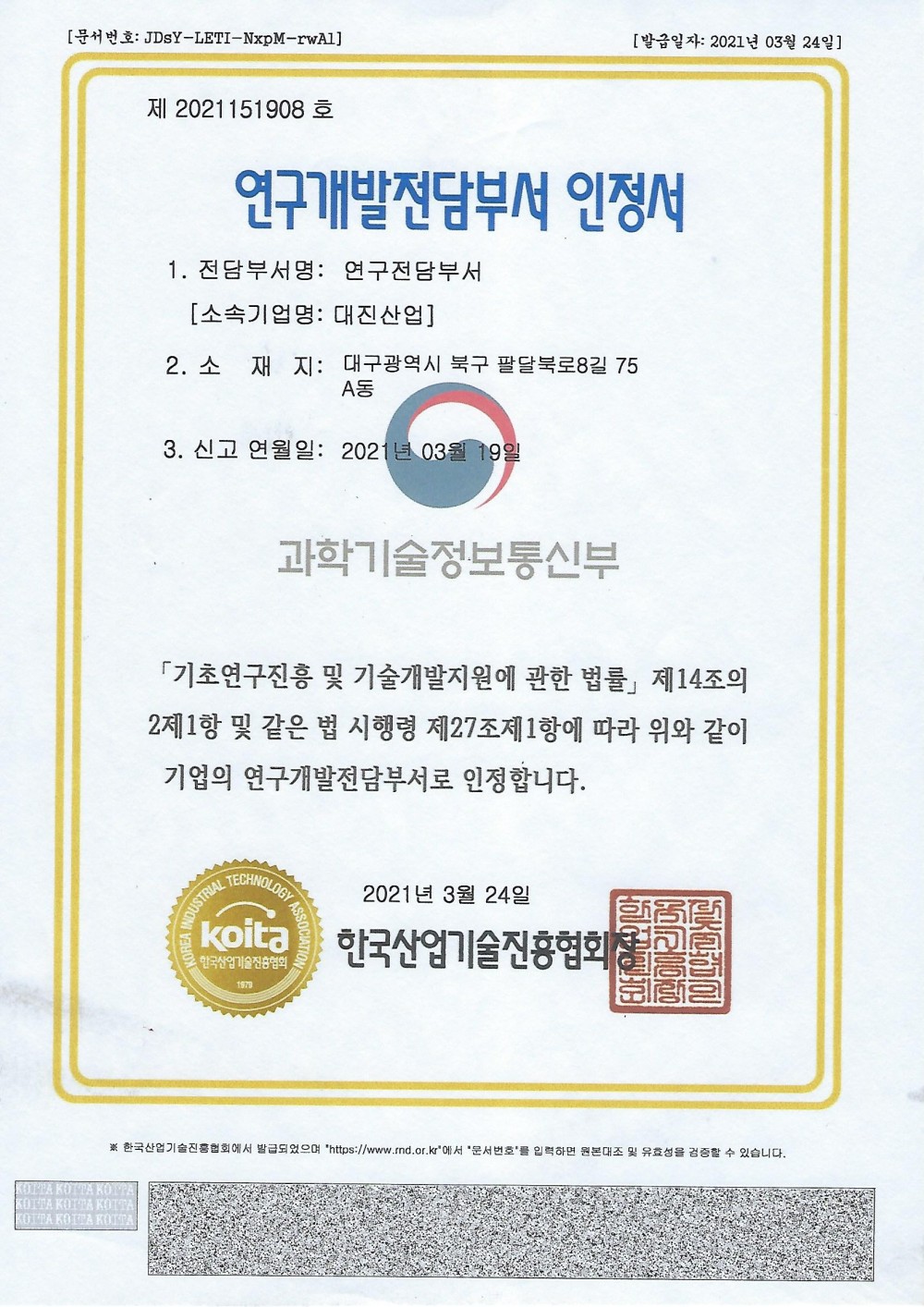 연구개발전담부서 인정서 페이지 정보 작성자최고관리자 댓글 0건 조회 105회 작성일 22-03-30 10:59 본문 목록 이전글이전글제목입니다. 17.07.14 다음글다음글제목입니다. 17.07.14 댓글목록 댓글목록 등록된 댓글이 없습니다.